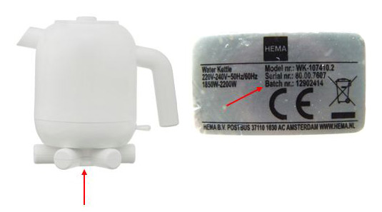 Wij hebben geconstateerd dat de witte waterkoker Ketelbinkie met artikelnummer 80.00.7607 en batchnummer 12902414, verkocht vanaf 10 september 2015, een constructiefout vertoont. Hierdoor kan de onderkant loskomen van de behuizing waardoor het water uit de waterkoker loopt. Dit kan brandwonden veroorzaken. Als u in het bezit bent van deze waterkoker, controleer dan het batchnummer op de plaats zoals hierboven aangegeven.