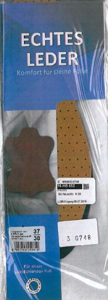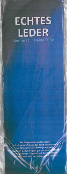 | Weiteres: | Einlegesohlen aus Leder und schwarzem Latexschaum mit Zusatz von Aktivkohle, verpackt in teilweise blau markierte, transparente Kunststoffverpackung mit Aufdruck „Echtes Leder“. Abgebildete Modellgröße 37/38 |