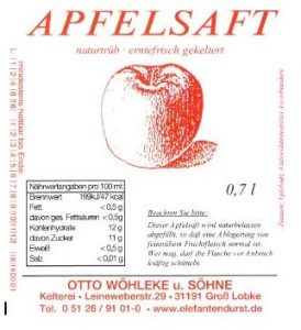 Die Kelterei Otto Wöhleke & Söhne mit Sitz in Groß Lobke (Landkreis Hildesheim) ruft aktuell das Produkt „Apfelsaft, naturtrüb“ aus dem Jahr 2014 mit dem Mindesthaltbarkeitsdatum Ende 12/ 2017 und der Losnummer L: 4/ 8/ 16 zurück.