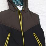 Beschreibung: Ärmellose Jacke in dunkelbraun und schwarz, aus Polyester-Material mit gelbem Reißverschluss, Taschen und eine Kapuze mit grünem „YOUNG VERSACE“ Futter und elastischen Kordeln mit Kordelstoppern