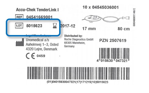 Die Chargen Nr. finden Sie auf der Umverpackung des Accu-Chek TenderLink Infusionssets (siehe Abbildung)