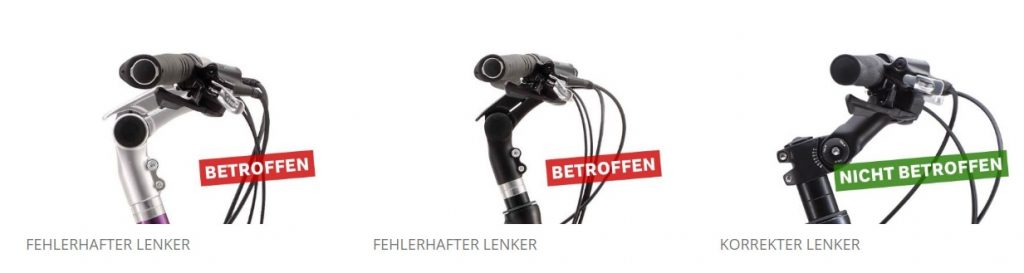 Kunden sind gebeten, die erwähnten Fahrräder nicht mehr zu benutzen und sie zwecks Austausch der Lenkervorrichtung in einen Coop-Bau+Hobby-Baumarkt zu bringen.
