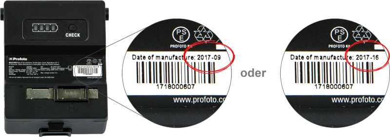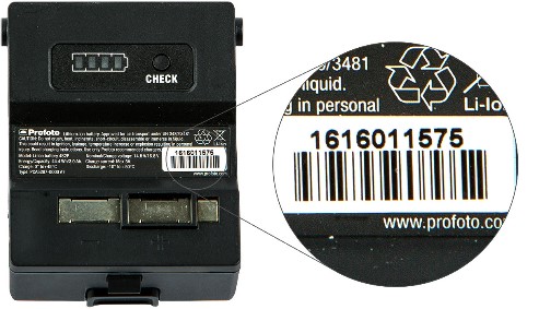 Die B1-Akkus mit der Produktnummer 100323 sind nicht vom Produktrückruf betroffen und können alternativ mit dem Profoto B1 und B1X verwendet werden. Die B1-Akkus sind daran zuerkennen, dass diese auf dem Seriennummernschild kein Herstellungsdatum tragen (siehe Abb.2)