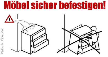 Daher von uns der eindringliche Appell an Eltern und Großeltern, alle Möbelstücke, die höher als 60cm sind entsprechend an der Wand zu befestigen um ein Kippen zu verhindern