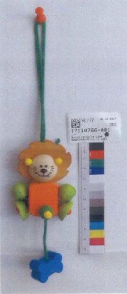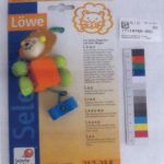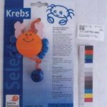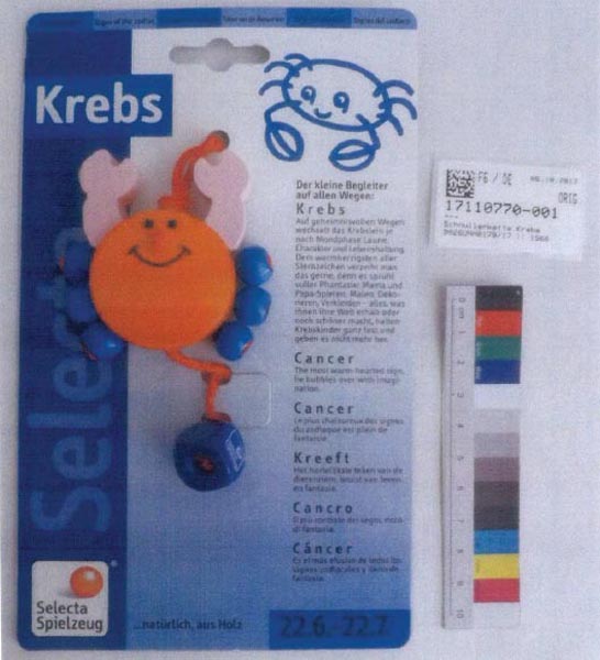 Beschreibung: Schnullerkette mit Holzspielzeug in verschiedenen Formen: Fische, Krebs, Löwe, Schütze, Waage, Wassermann, Zwillinge. Alle sind auf einem farbig bedruckten Kartonrücken befestigt.