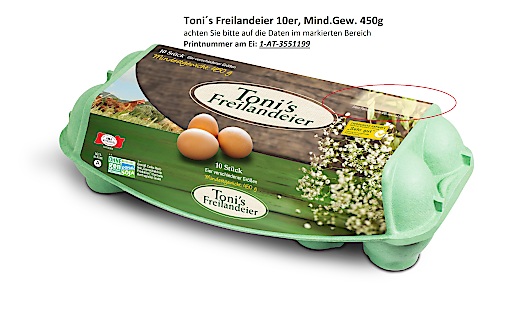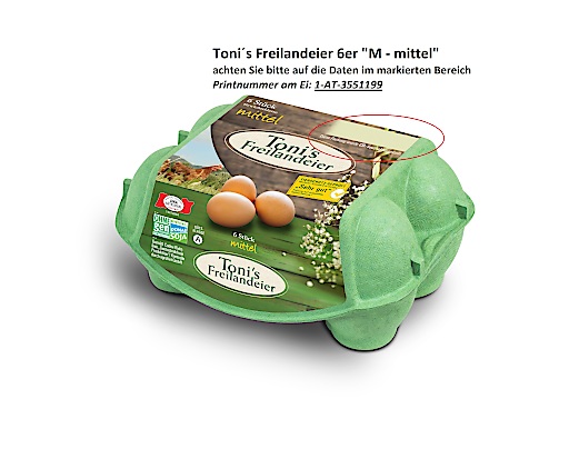 Die Toni’s Handels GmbH ruft Toni’s Freilandeier mit dem Erzeugercode 1-AT-3551199 zurück. Wie das Unternehmen mitteilt, wurde im Zuge der regelmäßigen tierärztlichen Kontrollen der landwirtschaftlichen Betriebe hinsichtlich Salmonellen, bei einem der rund 100 Erzeugerhöfe ein positiver Salmonellenbefund nachgewiesen.