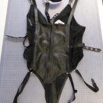 | Beschreibung: | Schwarzer Lederbody mit mehreren Lederriemen, verschiedenen Schnallen, silberfarbenen Metallnieten und schwarzen Textileinsätzen, hinten mit einem Reißverschluss. |