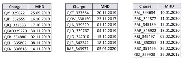 Betroffen sind die folgenden Chargen bzw. MHD Daten