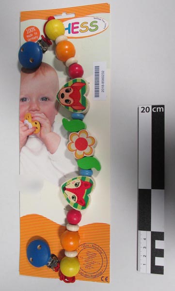 | Beschreibung: | Kinderwagenkette mit farbigen Holzelementen und Clips an beiden Enden |
