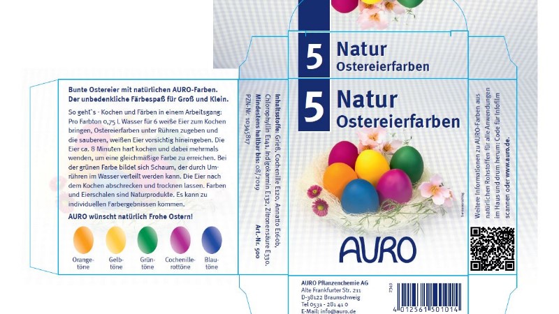 Der Hersteller AURO Pflanzenchemie AG informiert über nicht gekennzeichnete glutenhaltige Getreideart Weizen in dem Produkt „Natur Ostereierfarben“ mit dem MHD 08/2019.