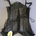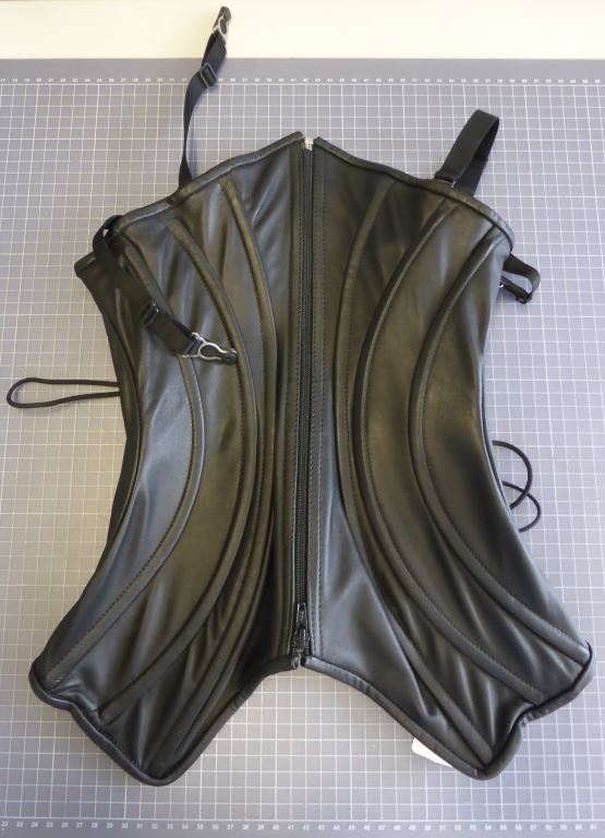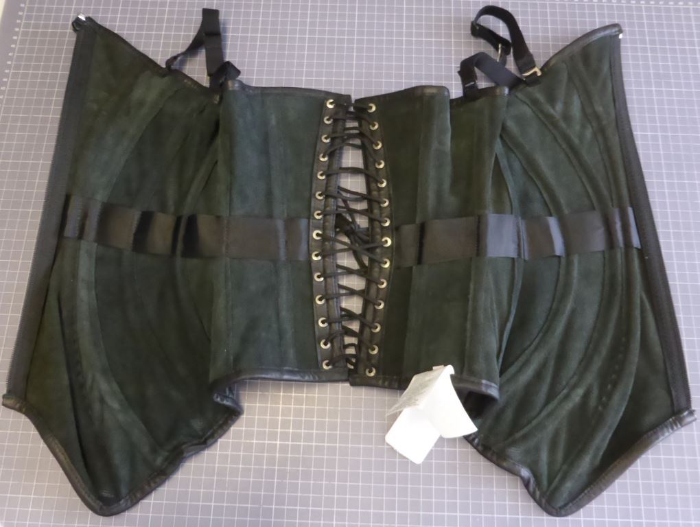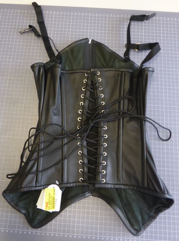 | Beschreibung: | Schwarze Ledercorsage mit mehreren Lederriemen, silberfarbenen Metallnieten |