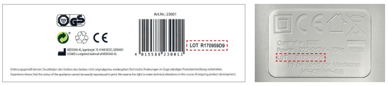 Die jeweilige Lotnummer ist auf den Unterseiten der Verpackung und des Controllers zu finden (siehe Abbildung unten).