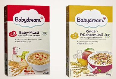 ROSSMANN informiert über den Rückruf der Artikel „Babydream Baby-Müsli & Babydream Kinder-Früchtemüsli“ Wie das Unternehmen mitteilt, können sich in den genannten Produkten Teile von Apfelstielen befinden.