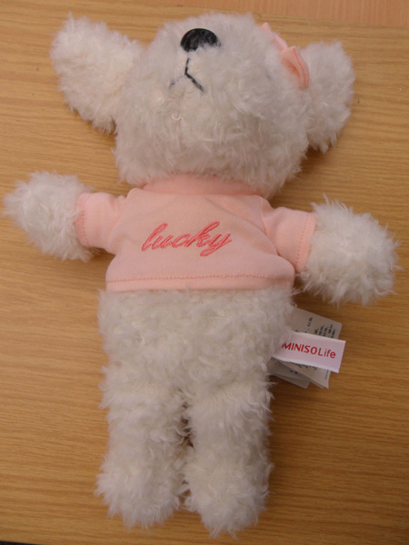 | Beschreibung: | Weißer Teddybär mit einem T-Shirt mit der Aufschrift „Lucky“. Größe: 17 x 12 x 28 cm. |