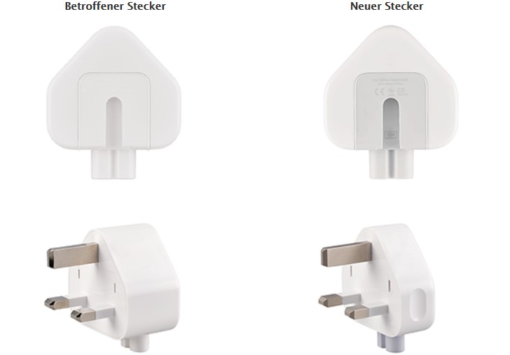 Verbraucher können anhad der folgenden Beschreibung selbst feststellen, ob ihr Adapterstecker von dem Rückruf betroffen ist. Die betroffenen Netzteilstecker Netzteilstecker mit drei Stiften sind komplett weiß und haben keinerlei Buchstaben an der Innenseite der Verbindungsstelle zum Netzteil von Apple.