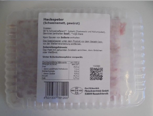 Die „Gut Erkenloh Fleischvertriebs GmbH“ informiert über den regionalen Warenrückruf von „Hackepeter (Schweinemett gewürzt)“ in der 300 g Packung. Wie das Unternehmen mitteilt, wurden im Rahmen einer Kontrolle in einer Probe Listerien nachgewiesen.