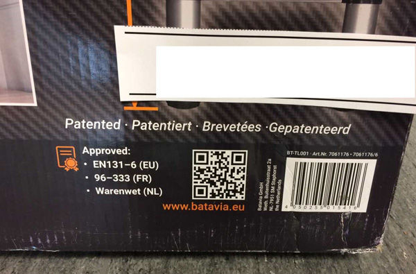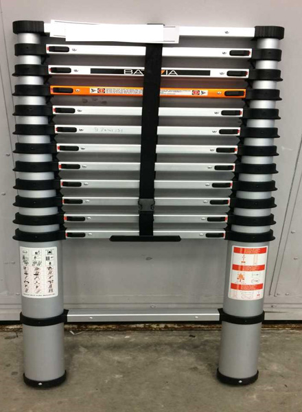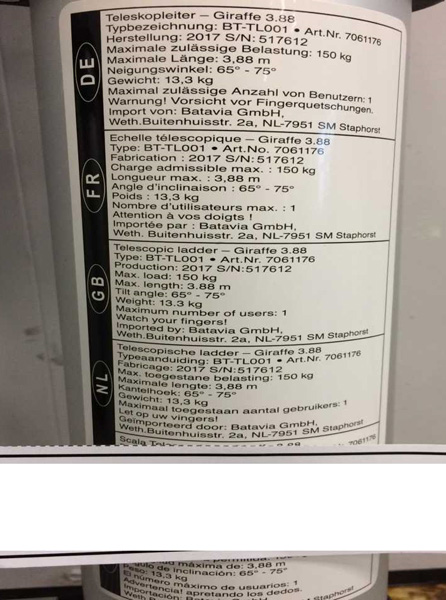 Das europäische Schnellwarnsystem RAPEX informiert über Sicherheitsmängel bei der untenstehenden Teleskopleiter – Giraffe 3.88 der Marke Batavia. Der Meldung zufolge kann der Nutzer aufgrund mangelhafter Stabilität von der Leiter stürzen.