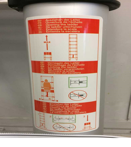 | Produktrisiko: | Die Winkeldrehung der Leiter ist zu hoch und beeinträchtigt die Stabilität des Benutzers. Der Benutzer kann dadurch das Gleichgewicht verlieren und von der Leiter fallen. |
