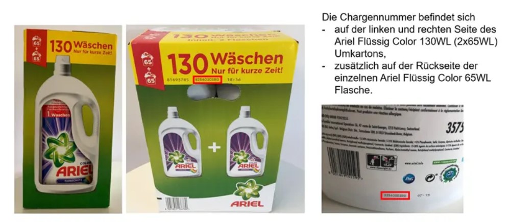 Von dem Rückruf ist ausschließlich die Chargennummer 92540303R0 von „Ariel Color Flüssigwaschmittel“ mit 130 Waschladungen (2x65WL) betroffen, das ab dem 16.09.2019 in Lidl Filialen in Teilen von Baden-Württemberg, Bayern, Brandenburg und Mecklenburg-Vorpommern verkauft wurde. Andere bei Lidl sowie bei anderen Einzelhändlern verkaufte Ariel Waschmittel sind nicht betroffen, so das Unternehmen in einer Kundenmitteilung.
