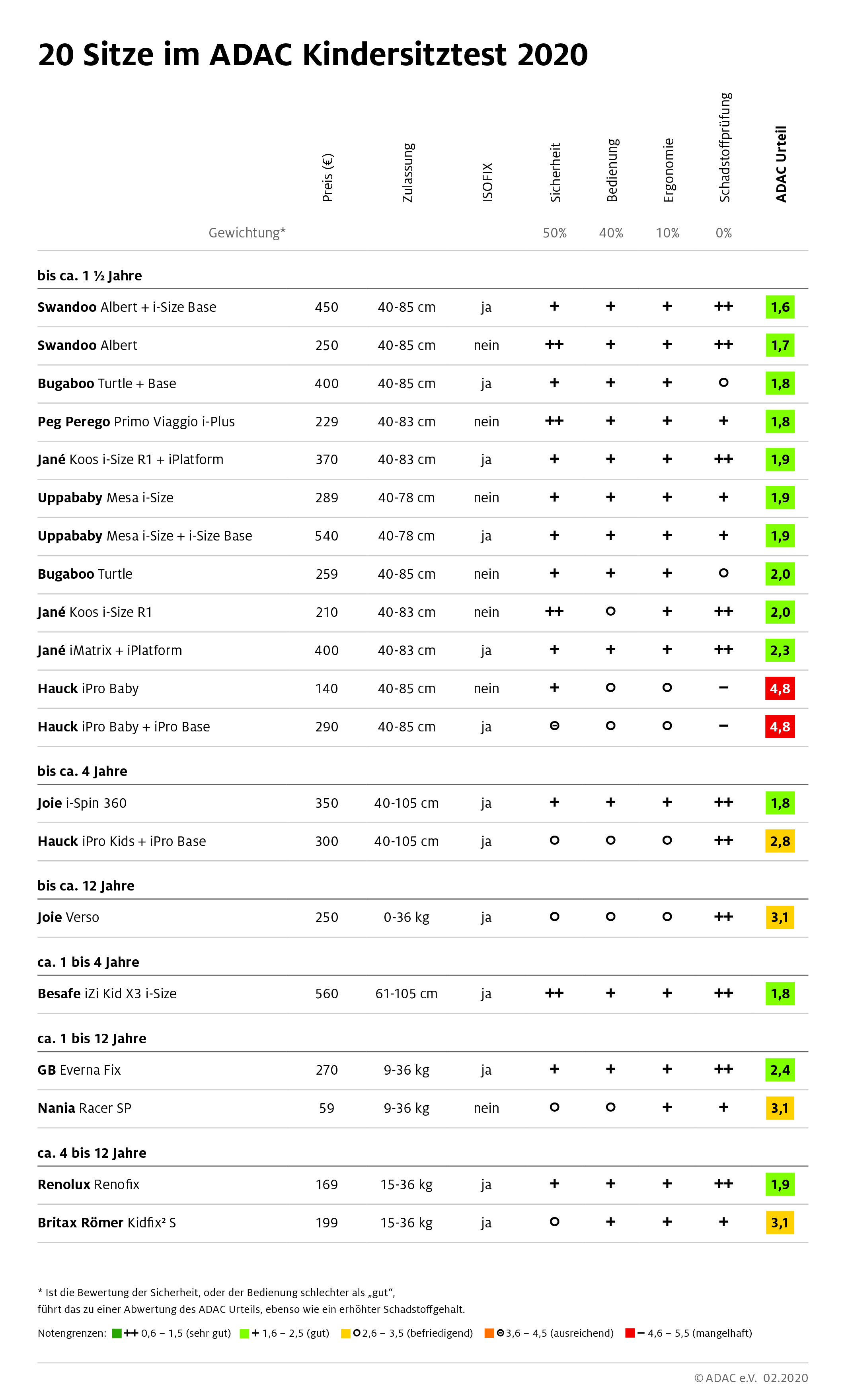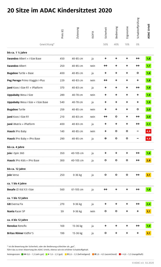 12 Modelle mit der Note „gut“ und vier weitere mit „befriedigend“, die die gesetzlichen Vorschriften zum Teil deutlich übertreffen: Das ist das Ergebnis des aktuellen Kindersitztests des ADAC. Dabei wurden 20 Kindersitze aller Größen in den Kategorien Sicherheit, Bedienung, Ergonomie und Schadstoffgehalt geprüft und bewertet.
