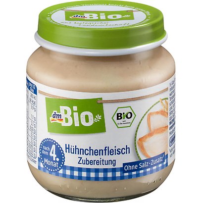 dm-drogerie markt ruft den Artikel „dmBio Hühnchenfleisch Zubereitung nach dem 4. Monat 125g“ zurück. Betroffen sind ausschließlich die Gläschen mit dem Mindesthaltbarkeitsdatum (MHD) 21.01.2021
