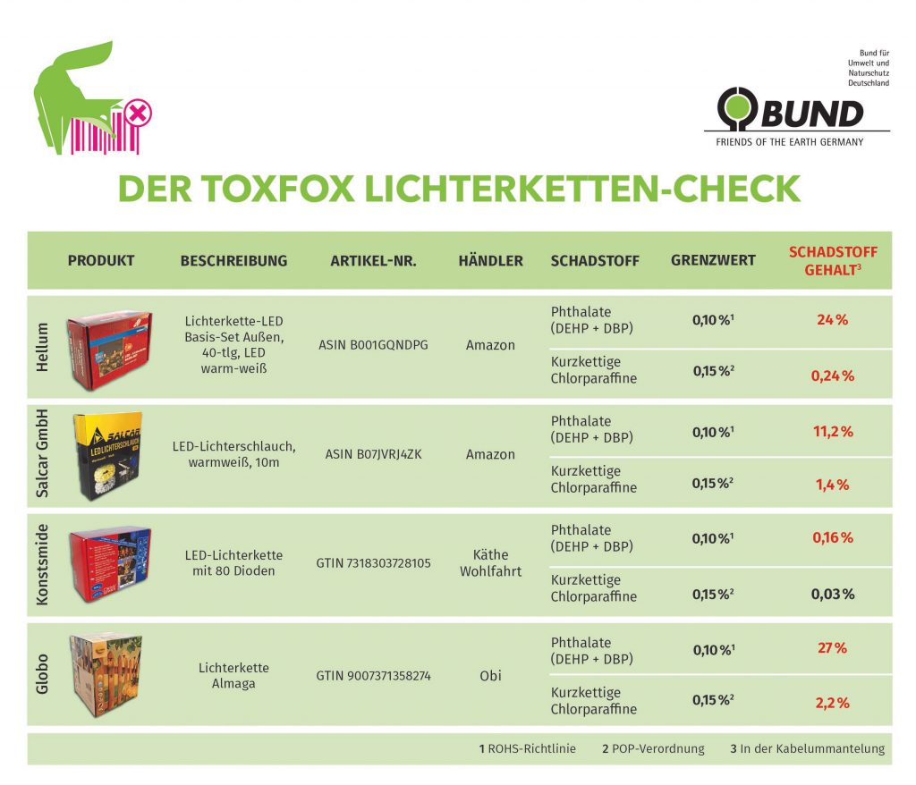 Die vom Labor nachgewiesenen Phthalate DEHP und DBP gelten als besonders bedenklich für die Gesundheit. Alle vier Lichterketten im Test waren zwischen 0,16 und 27 Gewichtsprozent mit diesen Schadstoffen belastet. Gemäß der europäischen Richtlinie zur Beschränkung von gefährlichen Stoffen in Elektro- und Elektronikgeräten (RoHS) dürfen Produkte mit Gehalten über 0,1 Gewichtsprozent europaweit nicht verkauft werden. Die Weichmacher können durch Ausdünsten, Auswaschung oder Abrieb aus der Weihnachtbeleuchtung entweichen und gelangen so in die Umwelt. In Innenräumen binden sie sich an Hausstaub und können so eingeatmet werden. DEHP und DBP ähneln den körpereigenen Hormonen und bringen das fein ausbalancierte Hormonsystem des Körpers aus dem Gleichgewicht. Eine Vielzahl von Erkrankungen und Störungen wird mit diesen Substanzen in Verbindung gebracht: unter anderem verringerte Spermienqualität, verfrühte Pubertät, Asthma, Brustkrebs, Fettleibigkeit, Diabetes sowie erniedrigte Intelligenzquotienten und das Aufmerksamkeits-Defizit-Syndrom (ADHS).