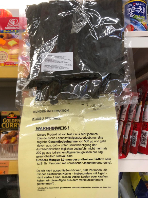 In dem Produkt „Konbu Seealgen“ von Arrow Global GmbH wurde ein überhöhter Jodgehalt festgestellt. Betroffen ist die Charge L 0318 mit dem Mindesthaltbarkeitsdatum 31.05.2021.