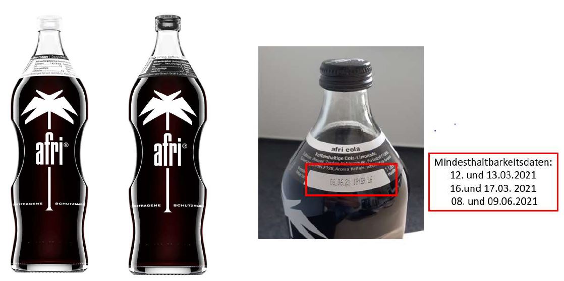 Niehoffs Vaihinger Fruchtsaft GmbH ruft afri Cola 10 mg Coffein und afri Cola ohne Zucker in der 1 l Glasflasche mit den Mindesthaltbarkeitsdaten 12.03.2021 und 13.03. 2021,16.03.2021 und 17.03.2021 sowie 08.06.2021 und 09.06.2021 wegen der Gefahr eines möglichen Glasbruchs zurück. Laut Flaschenhersteller weisen Flaschen mit den oben genannten Mindesthaltbarkeitsdaten eine Instabilität auf, die zu einer Rissbildung, schlimmstenfalls zu einem Zerbersten der Flasche führen könnte. Das Getränk selbst ist einwandfrei.