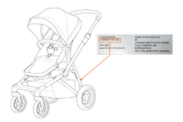 Die Produktnummer befindet sich auf dem Produkttypenschild am unteren Teil des Buggyrahmens in der Nähe des Gepäckkorbs.