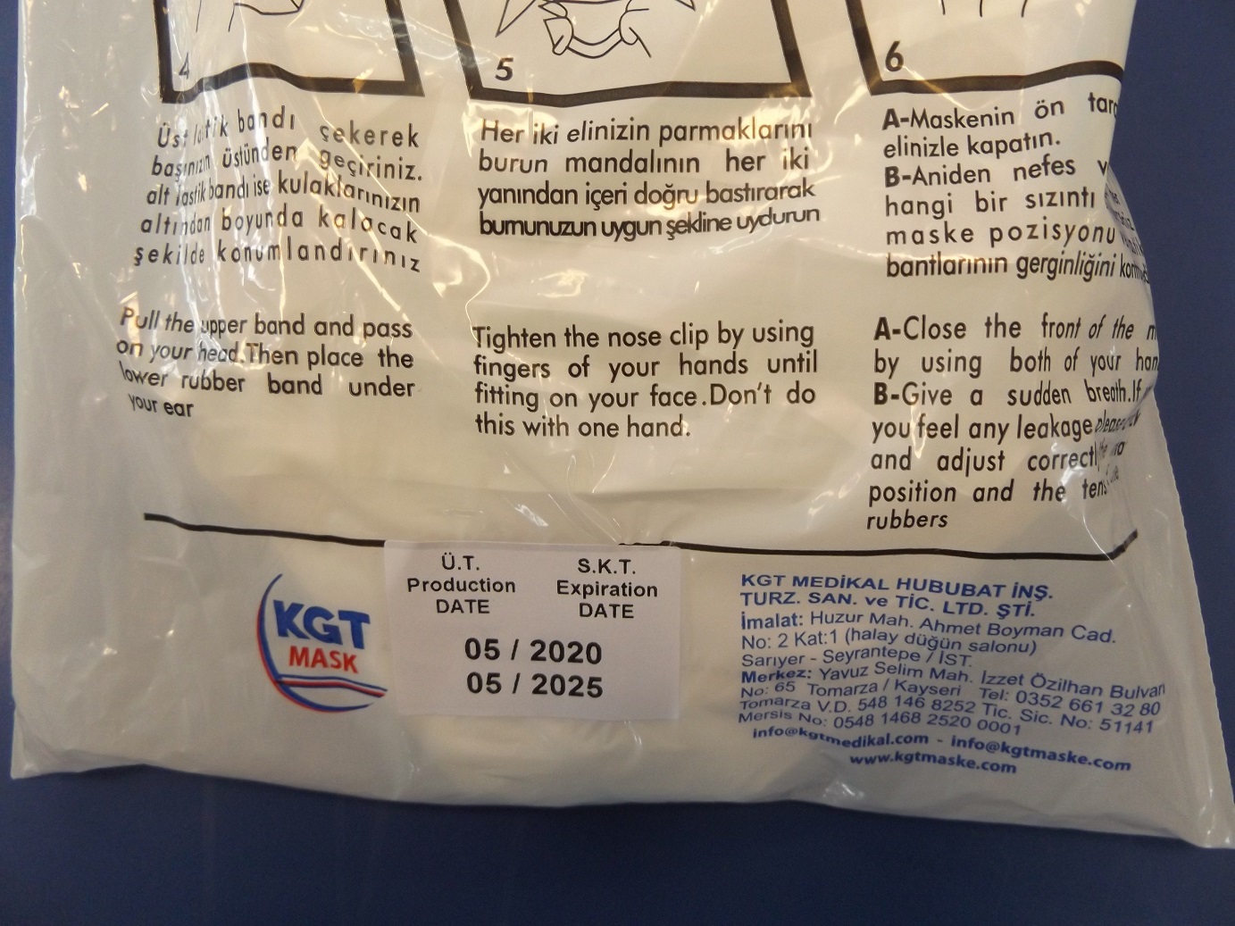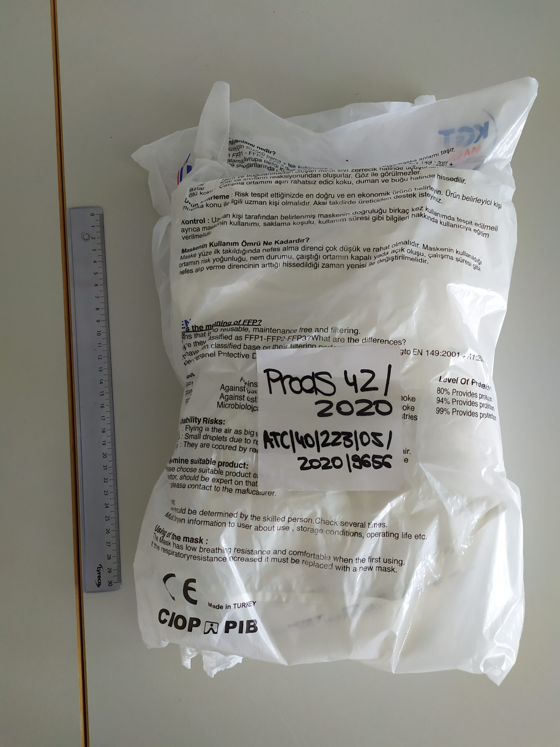 Die Partikel- / Filterretention des Materials ist unzureichend (Messwert ≤ 35%) und die Maske passt sich nicht richtig an das Gesicht an. Folglich kann eine übermäßige Menge an Partikeln oder Mikroorganismen durch die Maske gelangen und das Infektionsrisiko erhöhen, wenn sie nicht mit zusätzlichen Schutzmaßnahmen kombiniert werden. Produkt entspricht nicht der Verordnung über persönliche Schutzausrüstung und der einschlägigen europäischen Norm EN 149.