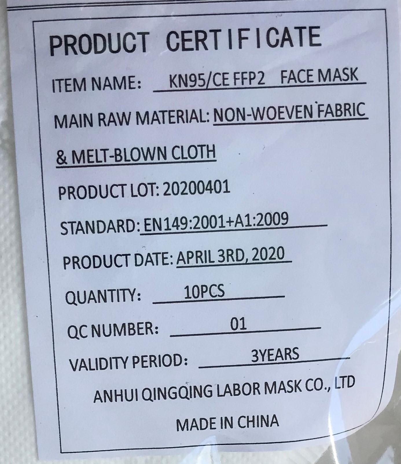 Vom Produktrückruf betroffen sind die Atemschutzmasken mit Bezeichnung «KN95/CE FFP2 Face Mask» des Herstellers «ANHUI QINGQING LABOR MASK CO., LTD». Die betroffenen Masken können anhand der Etikette auf der Verpackung identifiziert werden (vgl. beiliegendes Bild der Etikette auf der Verpackung).