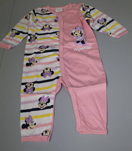 Babyschlafanzug, deutsche Gr. 62/68 (3-6 Monate), linke Vorder- und gesamter Rücken aus pinkfarbenem Stoff, rechte Vorderseite und beide Ärmel weiß mit mehrfarbigem Streifendruck, Minnie-Maus-Motive, Metallic Druckknöpfe mit rosa lackierten Oberflächen vom Hals bis zum linken Fuß.