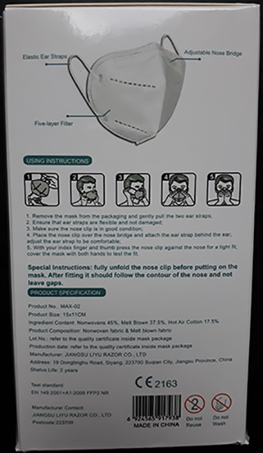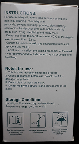Der physikalische Widerstand des Filtermaterials ist zu hoch (Messwerte des Ausatemwiderstands: bis 3,3 mbar). Folglich kann verhindert werden, dass eine ausreichende Luftmenge ausgeatmet wird und im schlimmsten Fall den Benutzer ersticken lässt. Das Produkt entspricht nicht der PSA-Verordnung und der einschlägigen europäischen Norm EN 149.