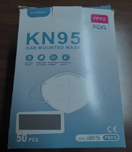 Das Produkt wird in einem Karton mit 50 Artikeln verkauft, die mit „KN95“, „FFP2“ und „FDA“ gekennzeichnet sind.