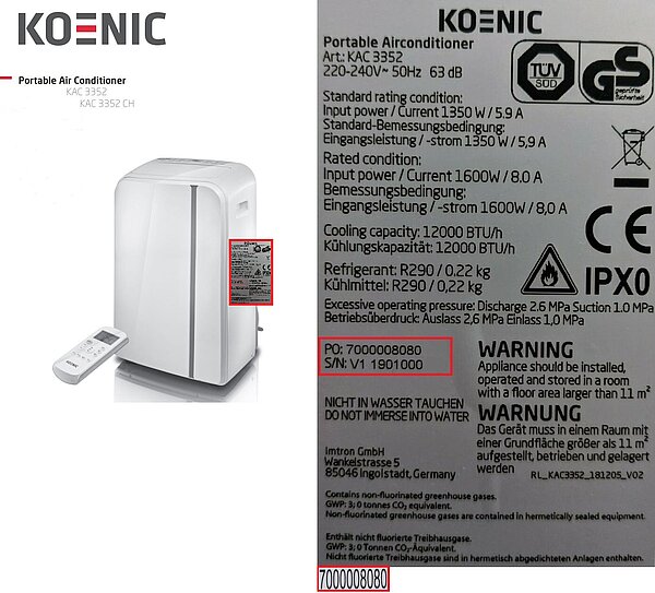 Die IMTRON GmbH informiert über den Rückruf bestimmter mobiler Klimageräte „KOENIC KAC 3352″ der Chargen mit der PO Nummern 7000008080, 7000008081, 7000008082, 7000008088“. Wie das Unternehmen mitteilt, könnte in sehr seltenen Fällen die Stromleitung des Kompressors des Geräts mit dem Kupferrohr des Kühlkreislaufs in Berührung kommen. Wenn das Gerät lange oder intensiv genutzt wird, kann sich die Ummantelung des Verdichterstromkabels abnutzen. Durch die Abnutzung kommt es zu einer elektrischen Funkenbildung an der Kupferleitung, wenn das Gerät weiterläuft, wodurch sich das Kältemittel und das Gerät selbst entzünden können.