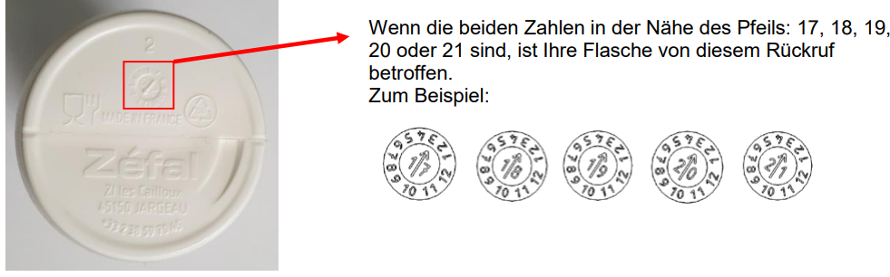 Die betroffenen Flaschen wurden zwischen Januar 2017 und Januar 2022 in einer Vielzahl von Aufdrucken und Farben verkauft. Alle betroffenen Modelle tragen den Schriftzug „ZEFAL“ auf dem Flaschenboden und sind mit einer Höhe von nur 158 mm und einer Füllmenge von 350 ml eindeutig als Kinderflaschen zu erkennen.