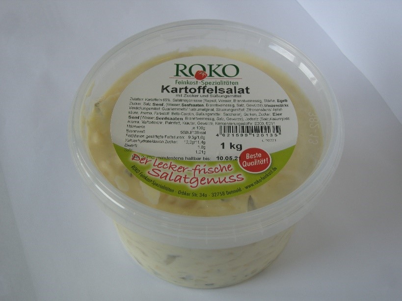 Die ROKO Feinkost GmbH informiert über den Rückruf des ROKO Kartoffelsalat im 1Kg Becher und dem MHD 03.08.2023. Wie das Unternehmen mitteilt, ist nicht auszuschließen, dass sich in dem Kartoffelsalat kleine Eisenteile oder Kunststoffteile befinden.