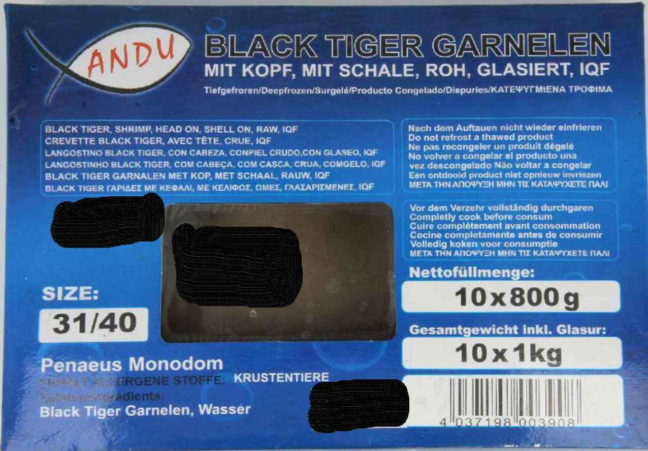 Die Anduronda-Import GmbH informiert sehr sparsam über den Rückruf des Artikels Black Tiger Garnelen, mit Kopf, mit Schale, roh, glasiert, IQF in der 800g Packung und dem Haltbarkeitsdatum 29.05.2024. Einen Grund für den Rückruf nennt das Unternehmen nicht.