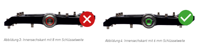 Bitte überprüfen Sie bei Ihren Pedalen umgehend die Schlüsselweite des Innensechskants, bevor Sie die Pedale wieder nutzen.