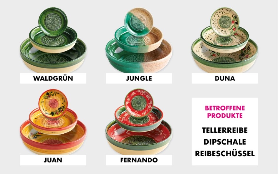 Die Carbon Clouds GmbH informiert über den Rückruf der Artikel evergrate Tellerreiben, Dipschalen und Reibeschüsseln der Designs Juan, Duna, Fernando, Jungle und Waldgrün welche bundesweit auf Messen und Märkten als auch Online verkauft wurde. Wie das Unternehmen mitteilt, ergab eine Untersuchung eine Grenzwertüberschreitung für Blei, wodurch das Produkt ein potenzielles gesundheitliches Risiko darstellt.