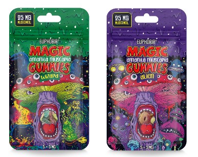 Von der tschechischen Behörde CAFIA (Czech Agriculture and Food Inspection Authority) wurde eine Warnung vor Euphoria Magic Muscimol Gummies Alien und Euphoria Magic Muscimol Gummies Wizard veröffentlicht. Die Packungen mit jeweils 5 x 3 Gramm Gummibärchen enthalten das psychotrope Alkaloid Muscimol des Fliegenpilzes (Amanita muscaria).