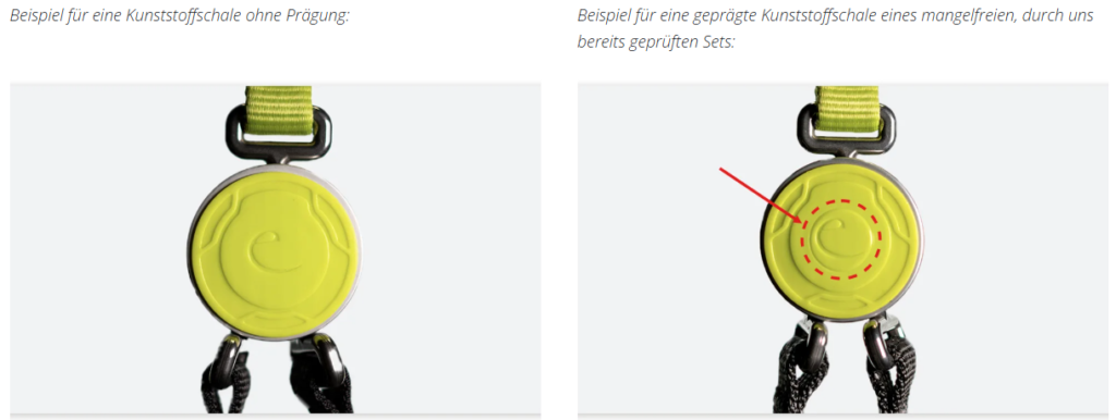 Sets der betroffenen Chargen, die von EDELRID bereits überprüft wurden, sind daran erkennbar, dass sich, wie unten abgebildet, auf einer der Kunststoffschalen ein geprägter Kreis um das Logo „e“ befindet.