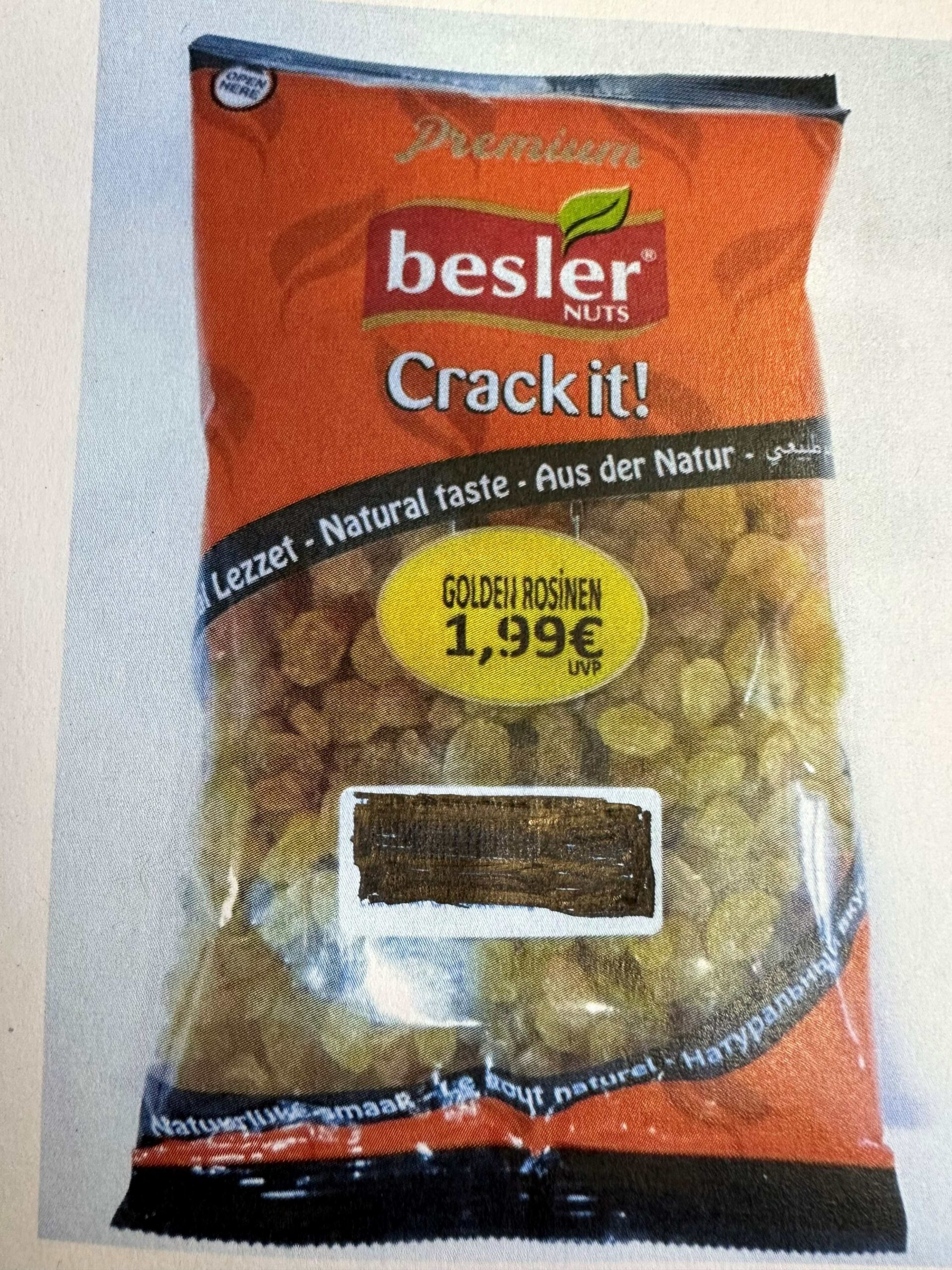 Die Zafer Großhandel GmbH informiert über den Rückruf des Artikels can besler Rosinen ohne Kerne mit dem Mindesthaltbarkeitsdatum 31.12.2026. Wie mitgeteilt wird, wurde Schwefeldioxid festgestellt, welches nicht auf der Tüte deklariert ist.