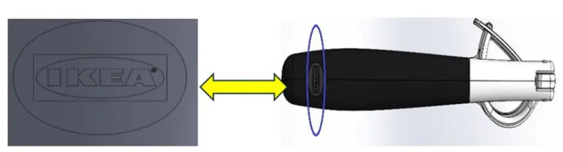 Betroffen von diesem Rückruf sind alle Datumsstempel von 2411 (JJWW) bis 2522 (JJWW). Alle betroffenen Produkte sind an einem Rahmen um das IKEA-Logo auf dem oberen Henkel des Produktes zu erkennen, der wie abgebildet aussieht:
