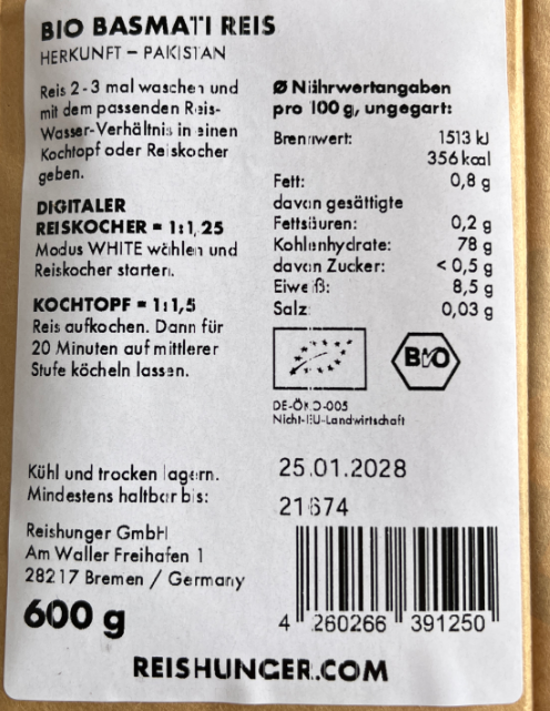 Die Reishunger GmbH informiert über den Rückruf verschiedener Bio Basmati Reis und Bio Wildreis Basmati Mix welcher bundesweit über den Onlinehandel vertrieben wurde. Wie das Unternehmen mitteilt, wurde eine Überschreitung des gesetzlichen Grenzwertes für Aflatoxin B1 festgestellt.